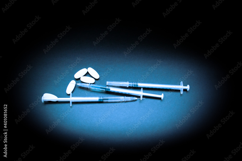Tableau sur toile Pills and Syringes - drug addiction concept with copy space
