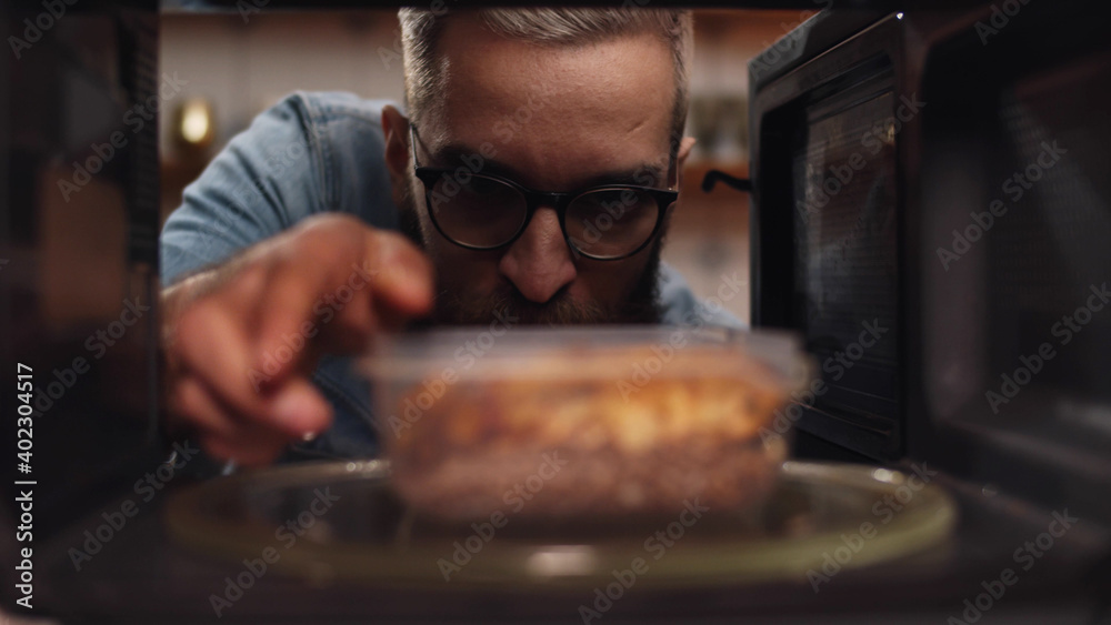 Tableau sur toile Man putting leftover dinner into microwave oven to cook