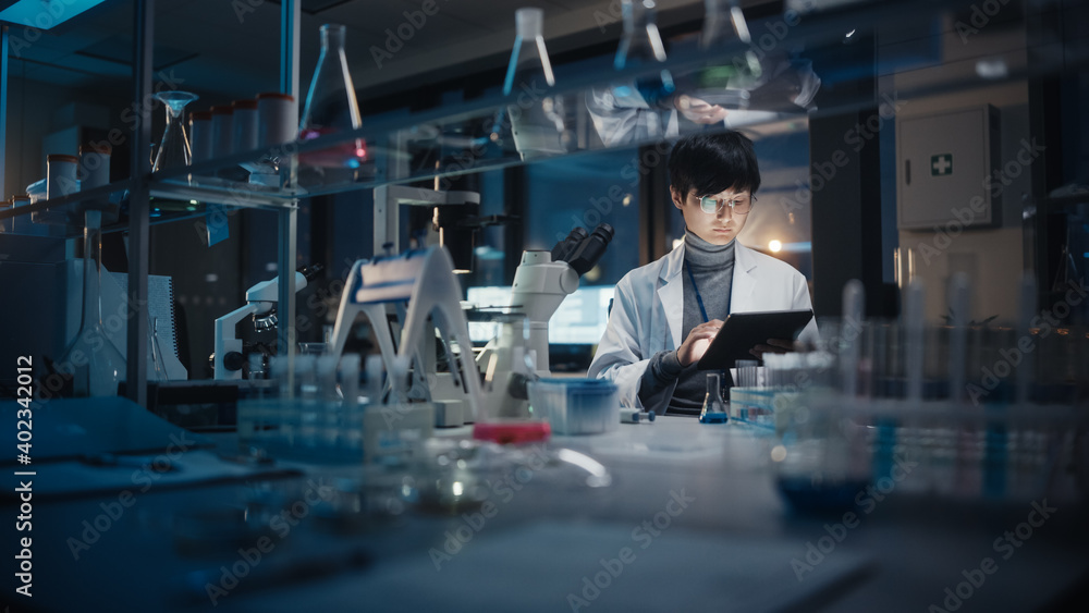 Tableau sur toile Medical Development Laboratory: East Asian Scientist Uses Digital Tablet Computer, Microscope, Conducting Experiment