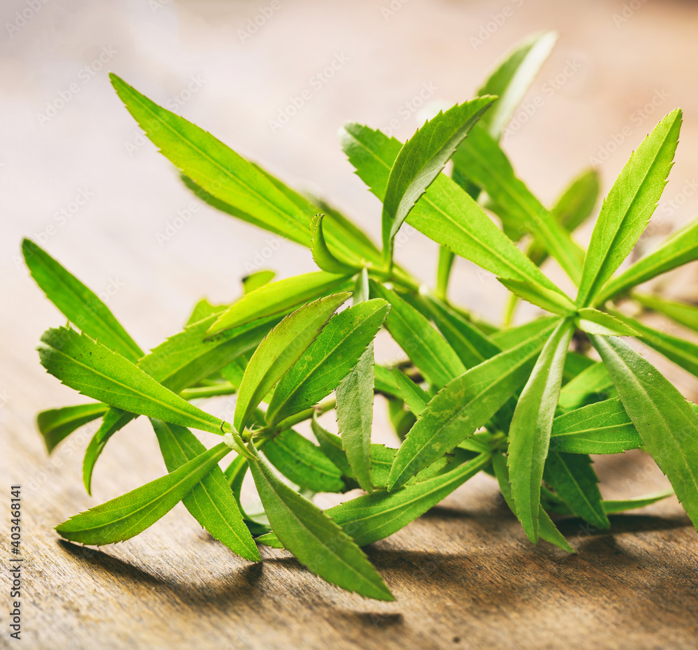 Tableau sur toile Fresh tarragon plant leaves on wooden background.