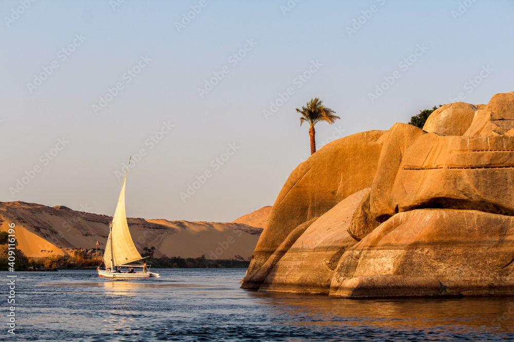 Tableau sur toile Sailboat on the Nile river at sunset, rock with ancient carvings in the front