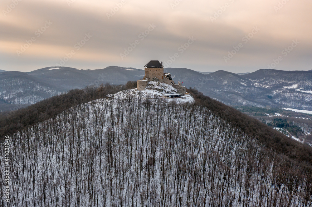 Tableau sur toile Hungary - Castle of Regec (Regéc) in the Zemplen mountains from drone view