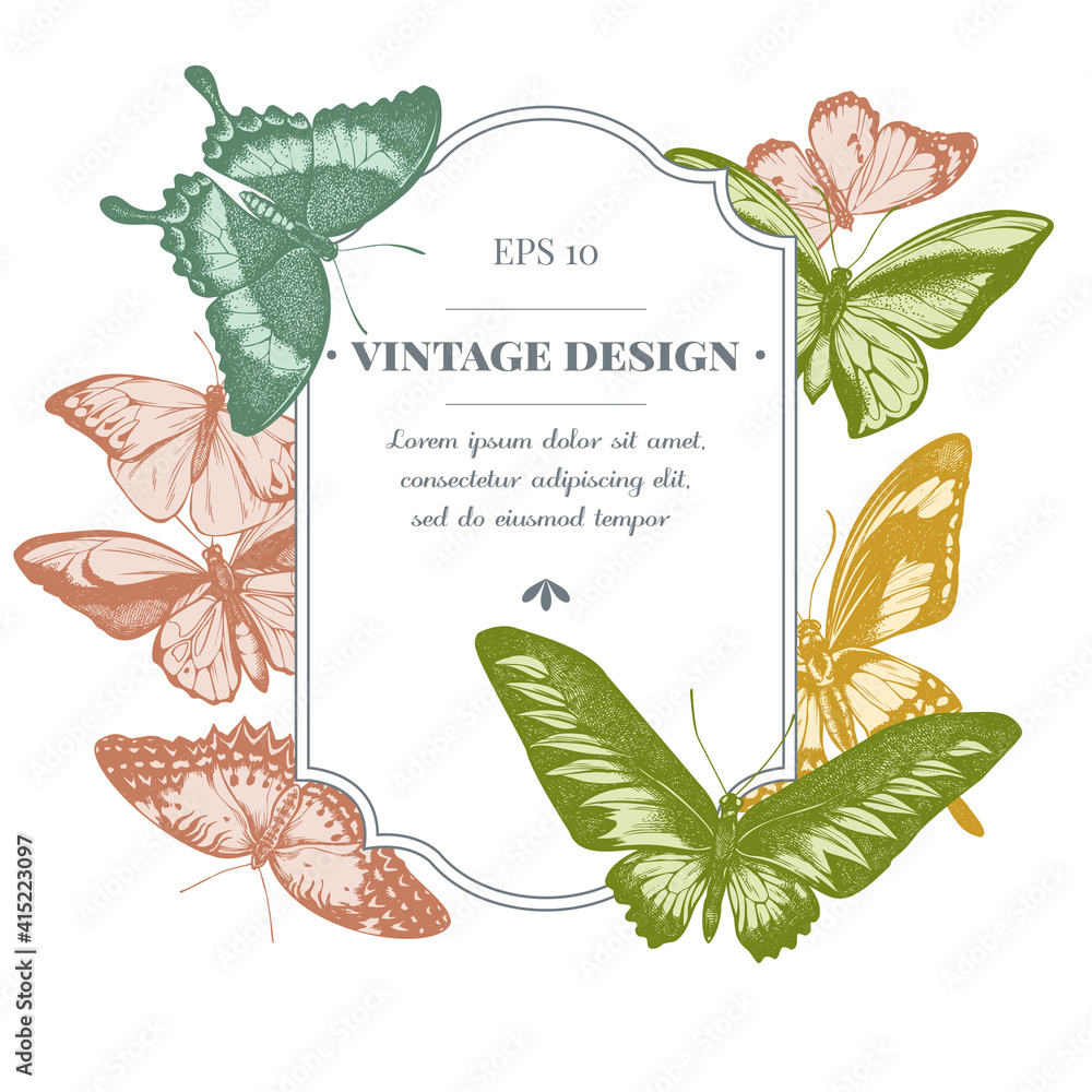 Tableau sur toile Badge design with pastel great orange-tip, emerald swallowtail, jungle queens, p