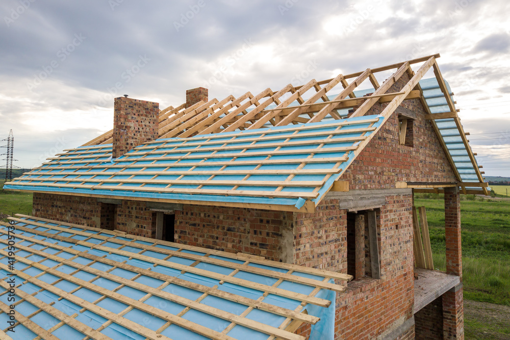 Tableau sur toile Aerial view of a brick house with wooden roof frame under construction