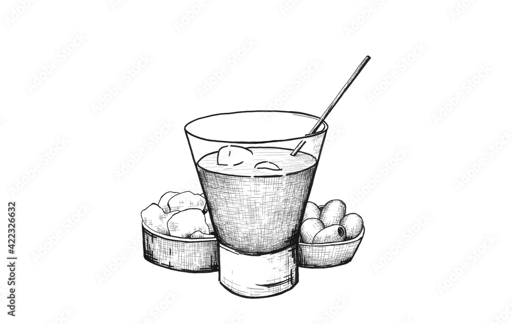 Tableau sur toile Ilustración a tinta de un vaso de vermut rojo, olivas y patatas chips