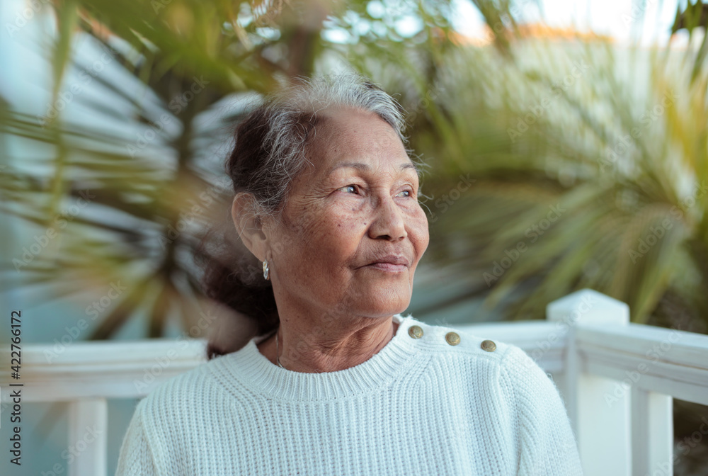 Beautiful senior filipino woman sitting in her garden, surrounded by palm trees