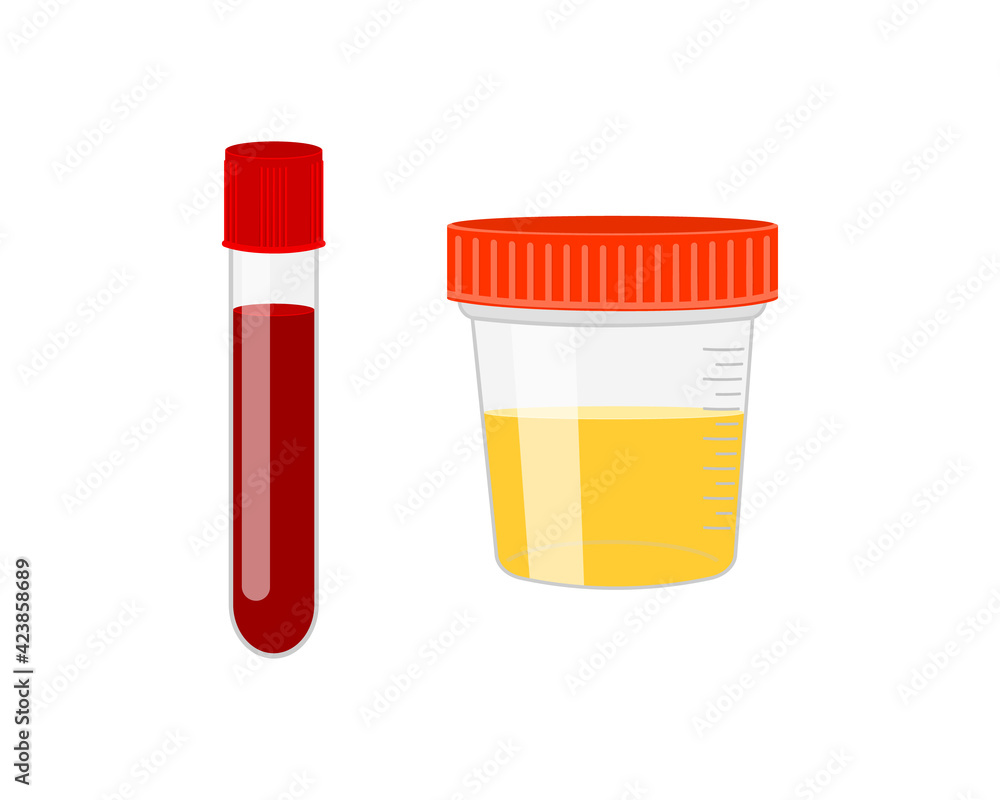 Test tube with blood and urine sample container isolated on white background. Urinalysis, blood medical analysis icons. Laboratory examination and diagnostics concept. Vector cartoon illustration.