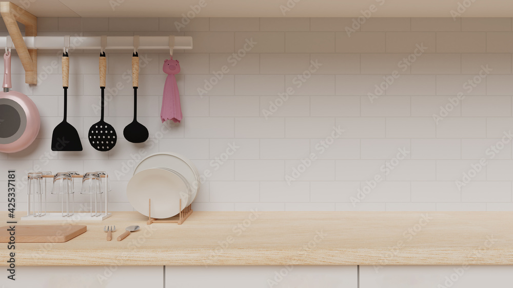 Tableau sur toile Cute cozy clean kitchenware background with pink pan clear glasses white plates wood counter brick wallpaper