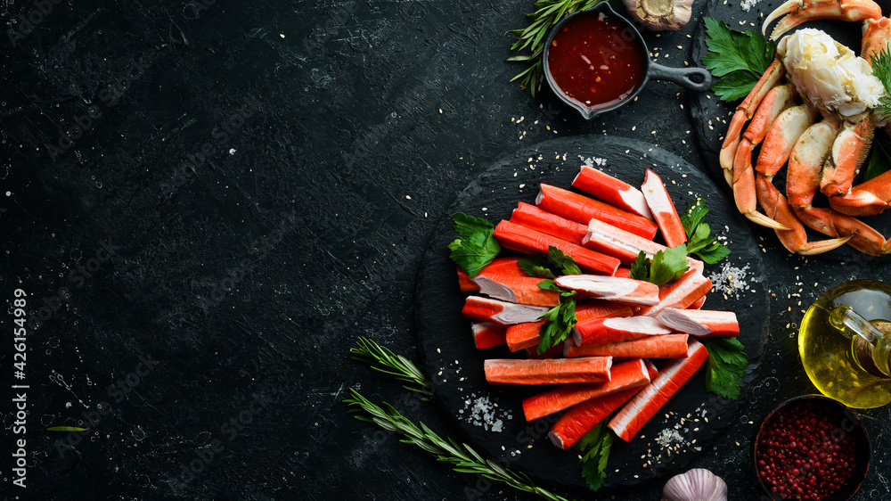Tableau sur toile Crab sticks from a crab on a black stone plate