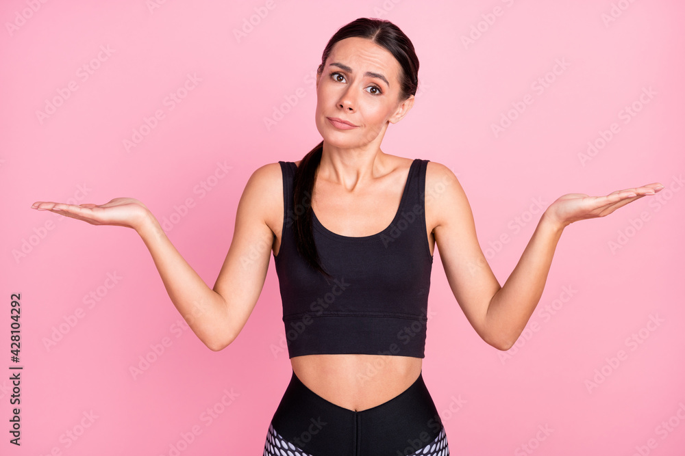 Tableau sur toile Photo of clueless young brunette woman shrug shoulders hold hands empty space sc