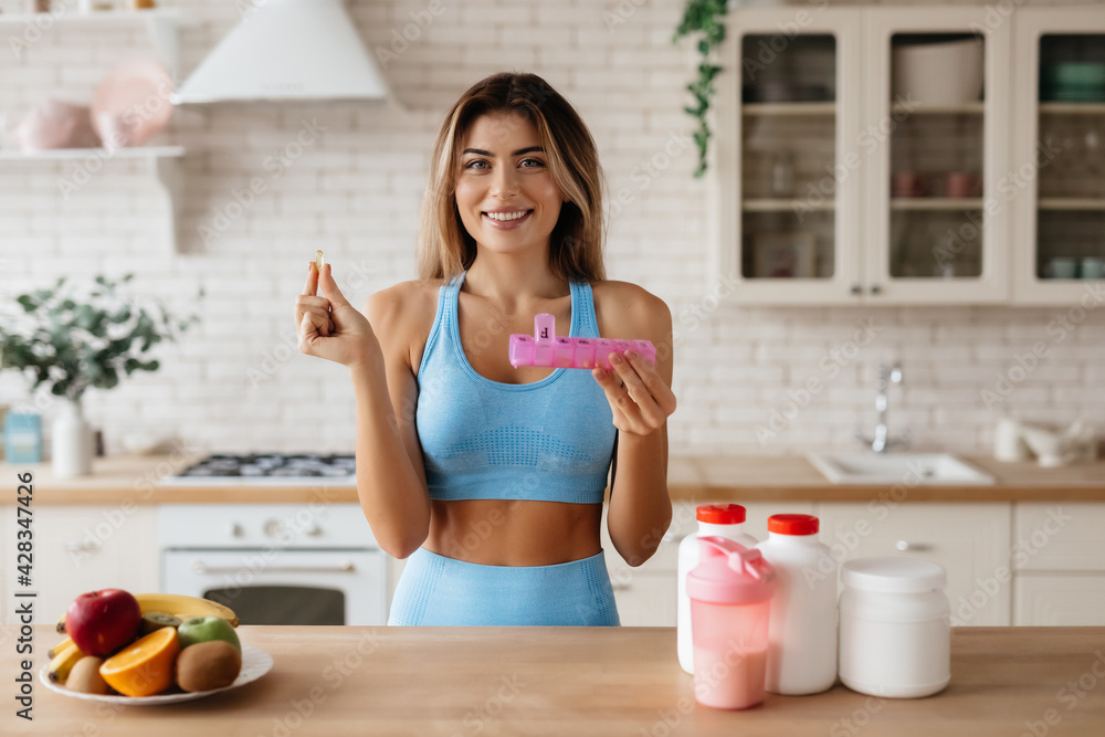 Tableau sur toile Healthy young lady taking vitamins daily for immune system boost