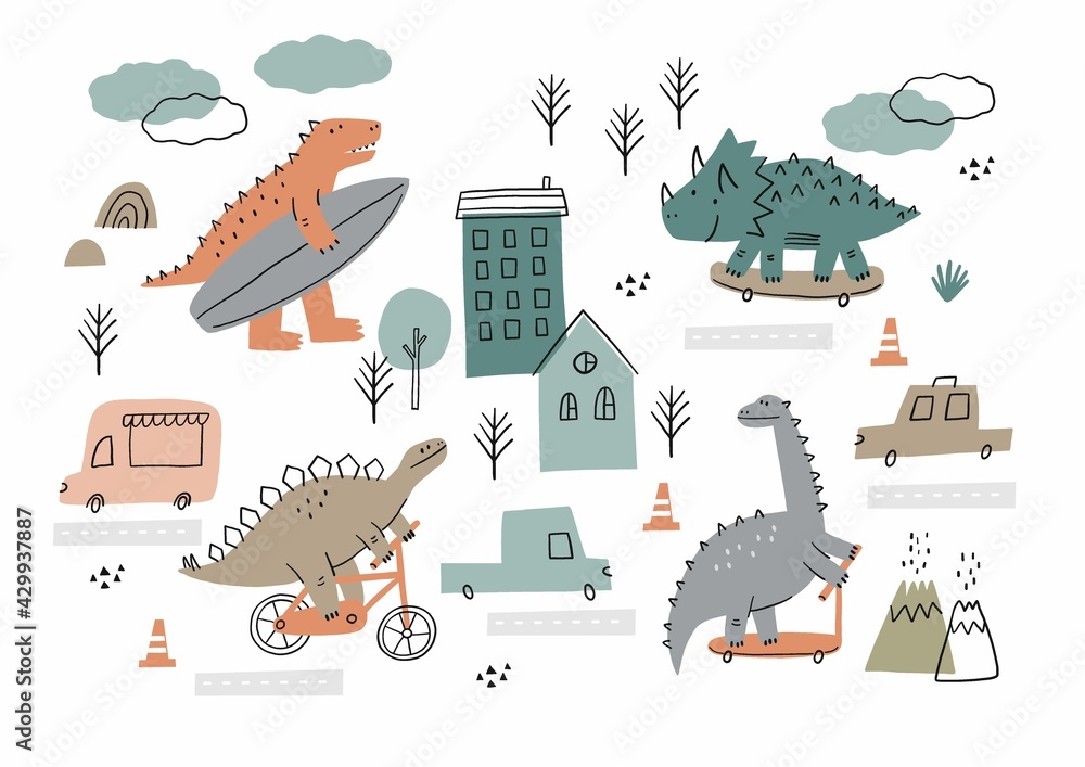 Tableau sur toile Cute cartoon dino on a skateboard, bike, surf, scooter in flat style