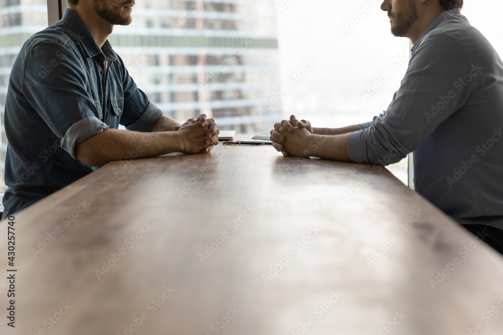 Tableau sur toile Determined young businessmen sit opposite at desk face each other talk speak at business meeting or negotiations