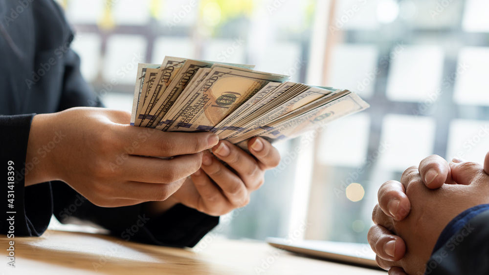 Tableau sur toile The businessman gives or pays his office with US dollar bills (USD) on spending and lending, loans and financial ideas