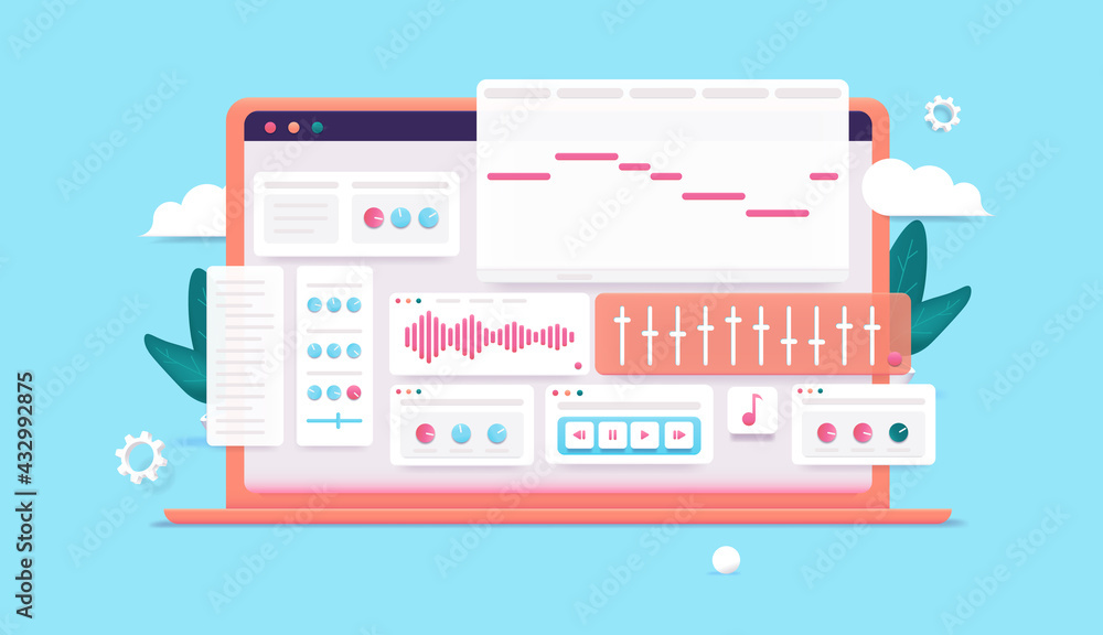Tableau sur toile Music production computer - Laptop with sound and audio software popping out of screen
