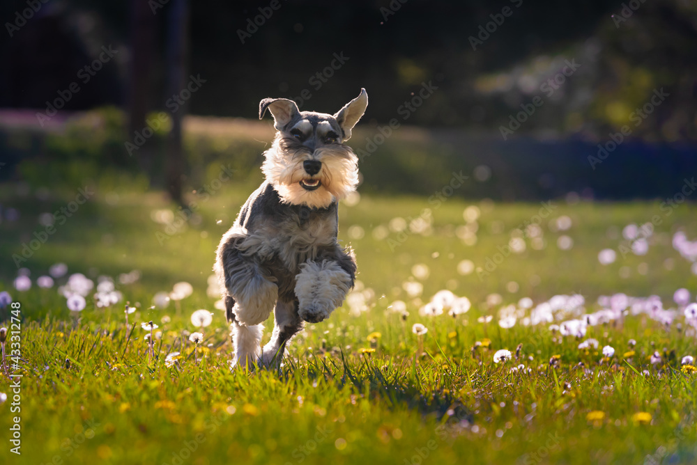 Tableau sur toile schnauzer dog running happily on green grass with yellow dandelions