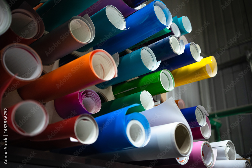 Tableau sur toile Rolls of vinyl film for use in advertising and pasting vehicles, are in producti