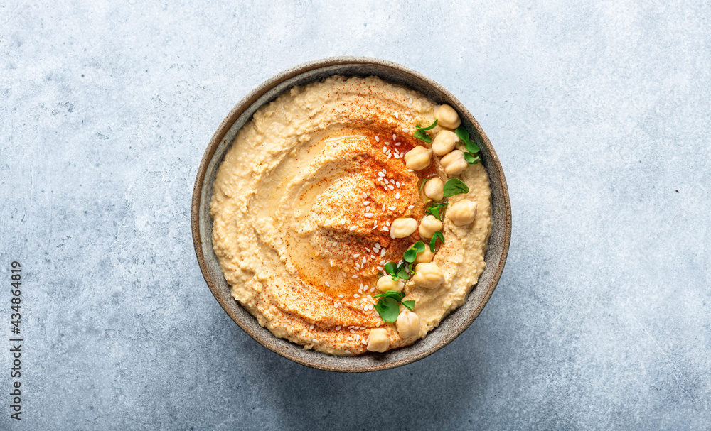 Tableau sur toile hummus in a ceramic bowl on a blue background, top view, copy space
