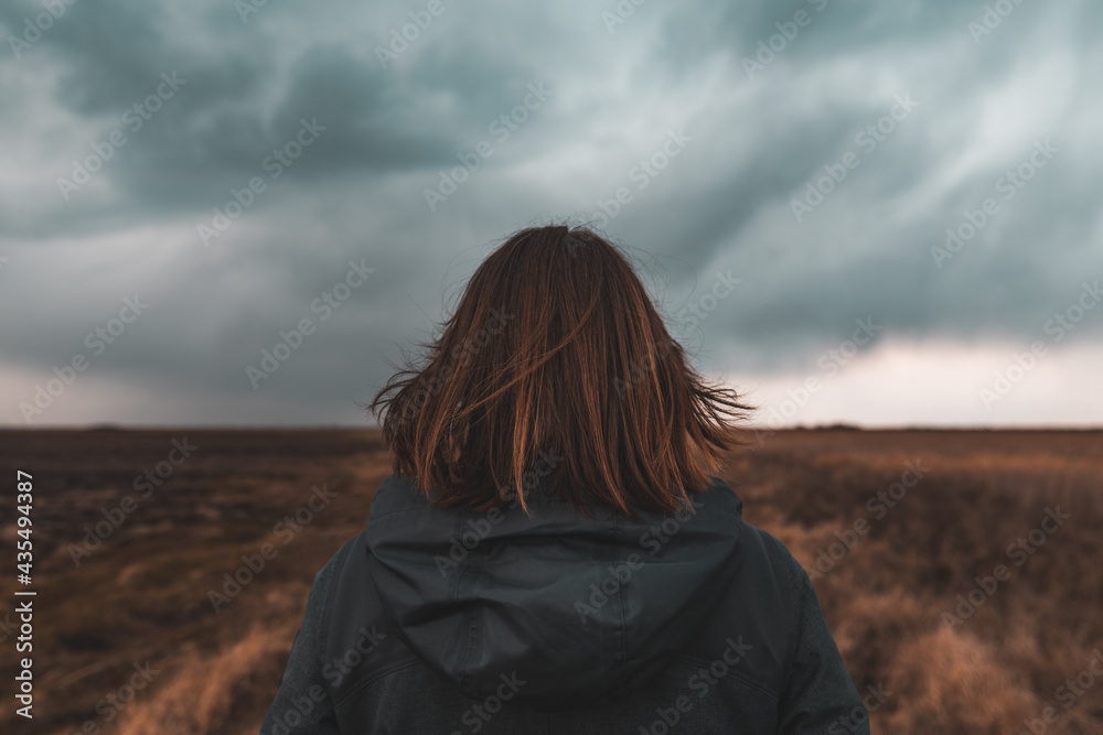 Tableau sur toile Woman standing in meadow, looking at the horizon and dark dramatic stormy clouds