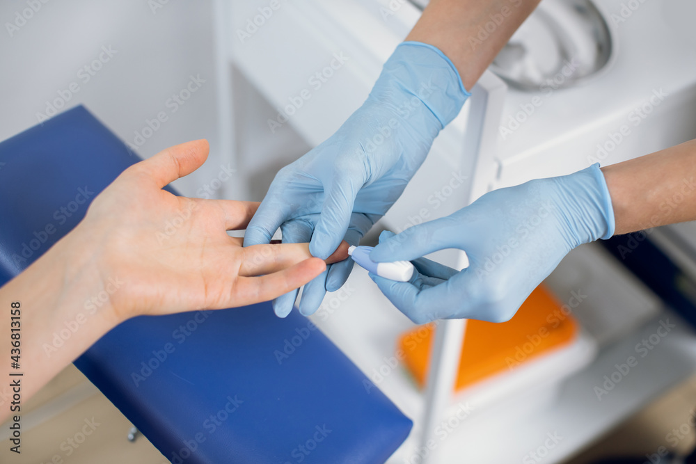 Tableau sur toile Close up of nurse lab technician in blue sterile gloves, using painless scarifier to prick the finger of unrecognizable patient, sitting on chair