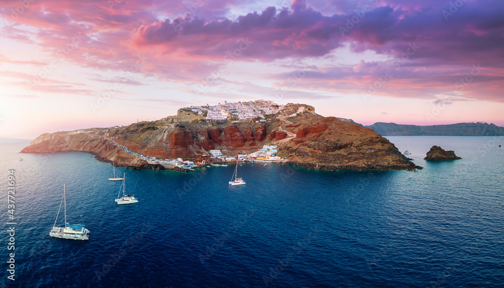 Tableau sur toile Panoramic aerial view to the villages of Oia and Ammoudi surrounded by the steep
