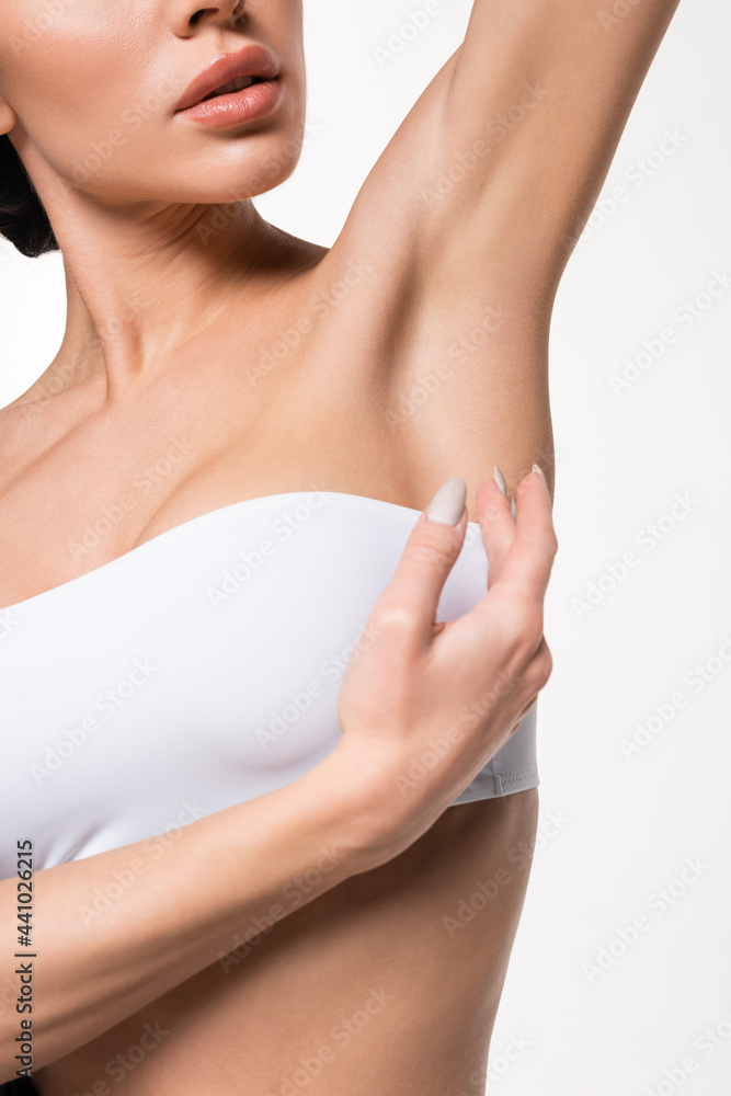 Tableau sur toile partial view of young woman in white top touching smooth armpit with hand isolated on white