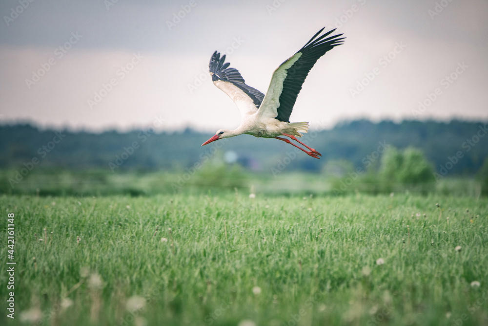 Tableau sur toile A beautiful stork hovers over a green meadow.
