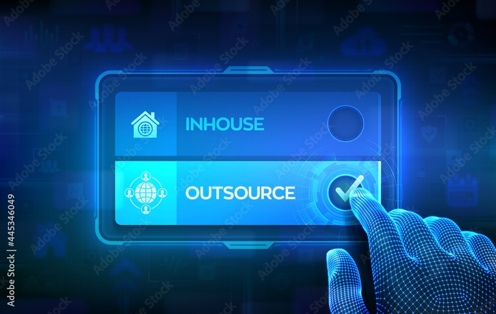Outsource or inhouse choice concept. Making decision. Outsourcing Global recruitment. Human Resources. Hand on virtual touch screen ticking the check mark on outsource button. Vector illustration.
