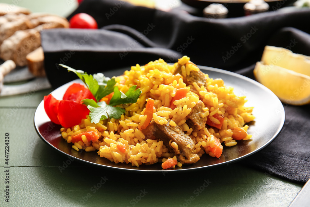 Tableau sur toile Plate with tasty pilaf on color wooden background