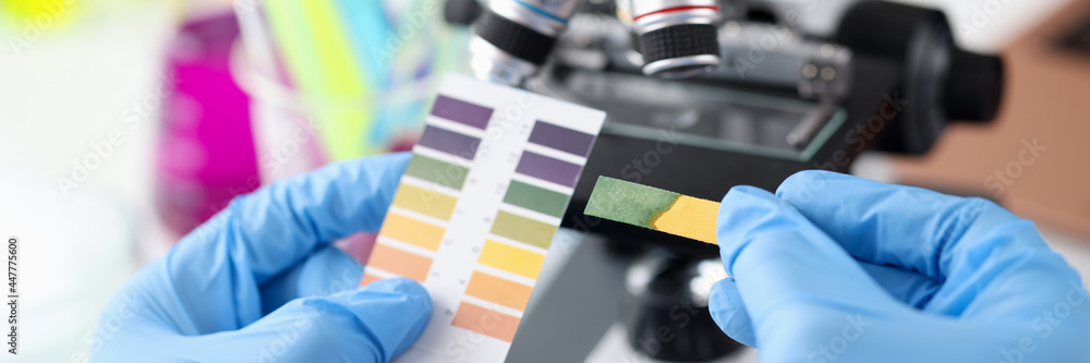 Tableau sur toile Scientist chemist holding ph test in his hands closeup