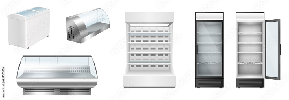 Tableau sur toile Set of vertical and horizontal fridges showcases with glass doors for display in