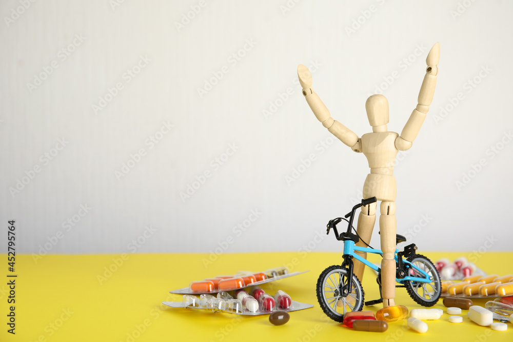 Tableau sur toile Pills, sportsman and bike model on yellow table, space for text