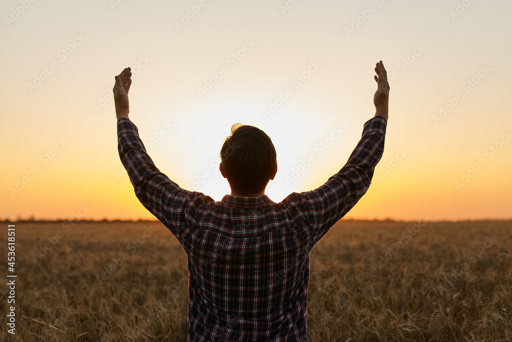 Tableau sur toile Man grateful for the harvest raised his hands up in the field