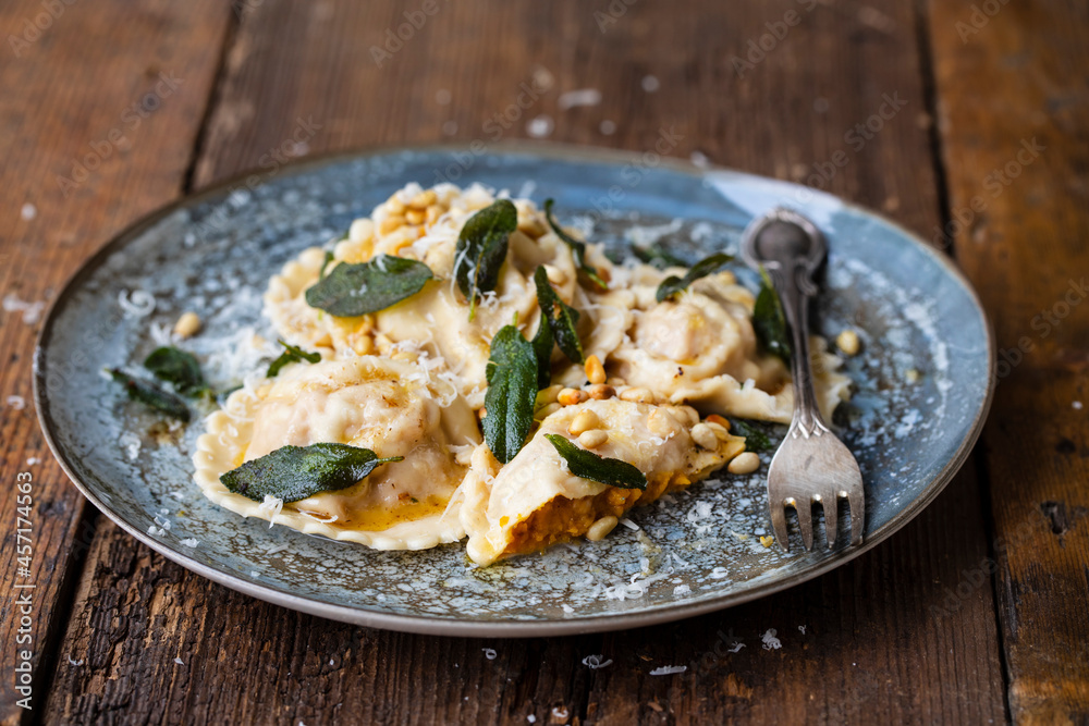 Tableau sur toile Home made pumpkin ravioli with crispy sage leaves and pinenuts