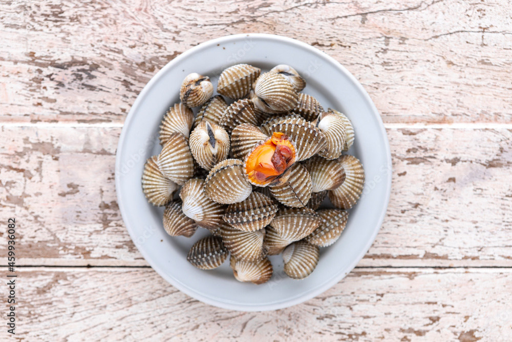 Tableau sur toile fresh steamed cockles, boiled cockles in ceramic plate on old white wood texture