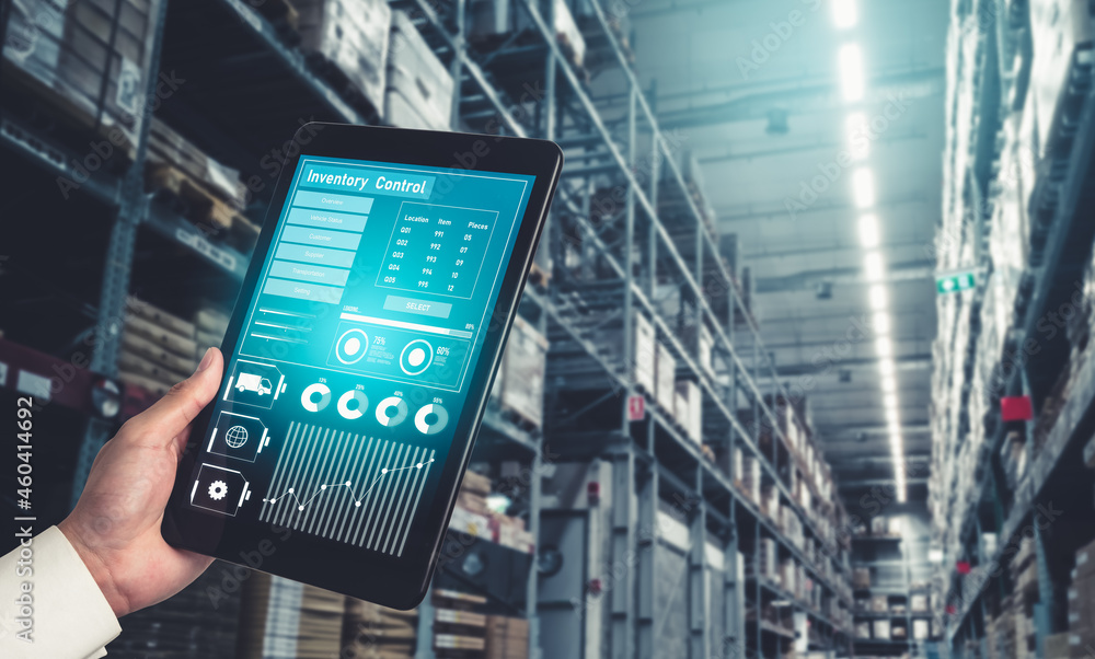 Tableau sur toile Warehouse management innovative software in computer for real time monitoring of goods package delivery