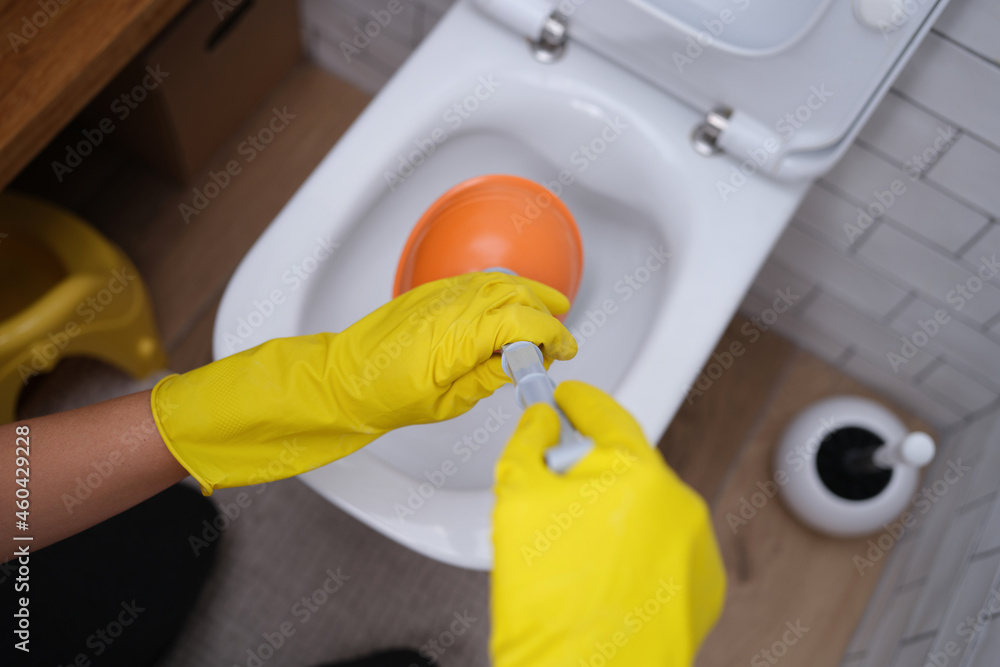 Tableau sur toile Person in yellow gloves and plunger cleans toilet closeup