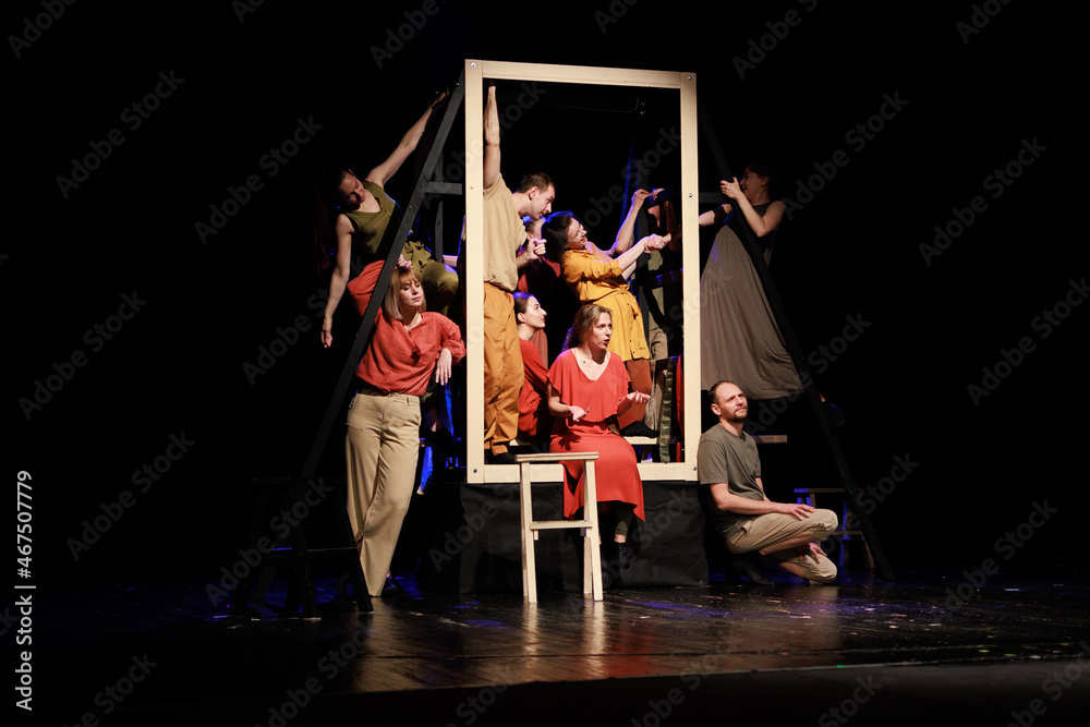 Tableau sur toile Actors and actresses perform a modern performance on the stage of the theater