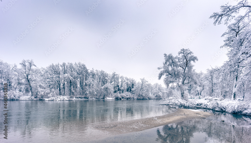 Tableau sur toile Verschneite Bäume am Fluss Reuss in Fischbach-Göslikon (Schweiz)