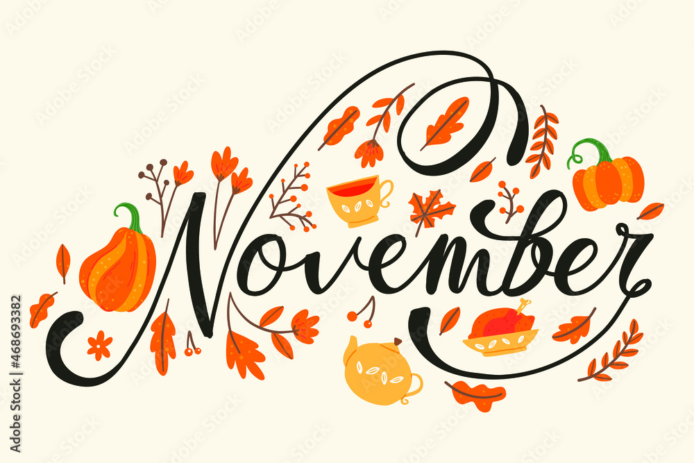 Tableau sur toile November Hand Lettering with Autumn Leaves Hand Drawn Decoration