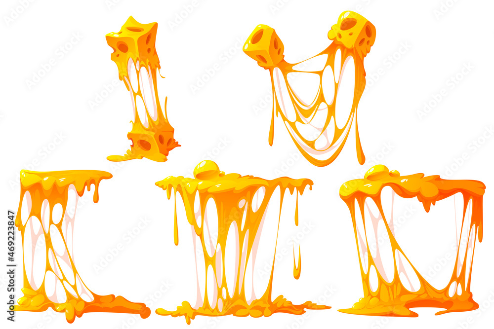 Tableau sur toile Set of melted cheese, cartoon mellow pieces with dripping stretches, design elem