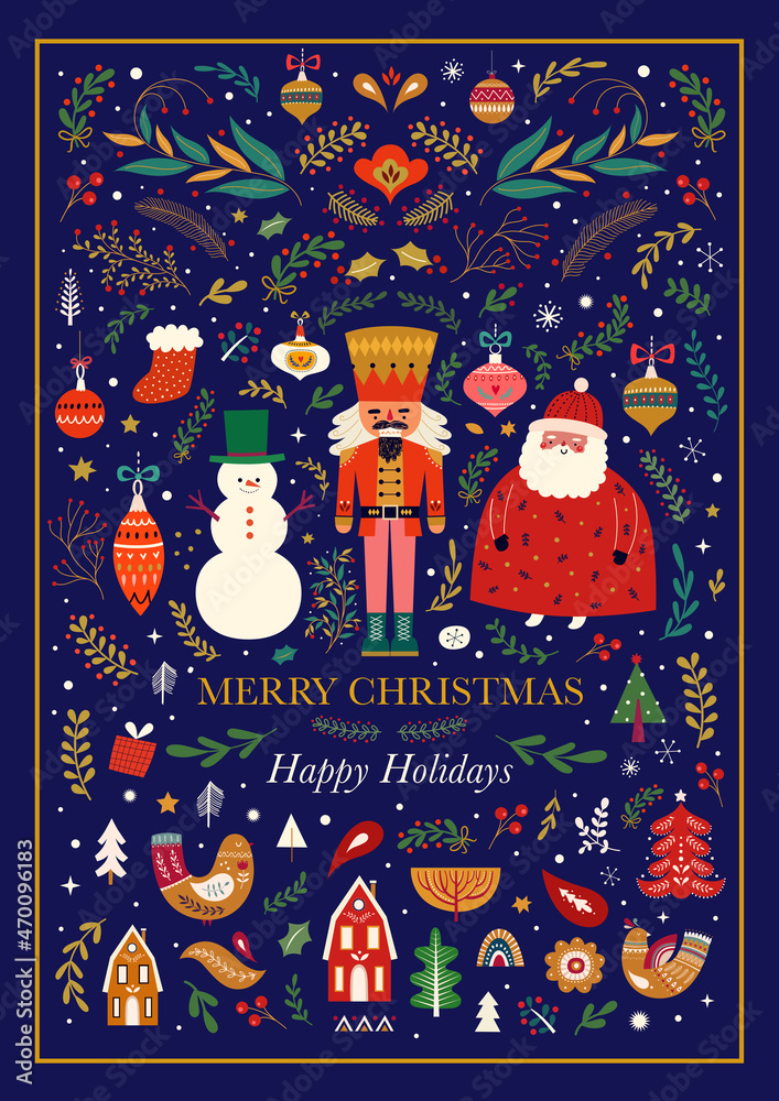 Tableau sur toile Classic Christmas greeting illustration with funny Santa Claus, nutcracker and snowman