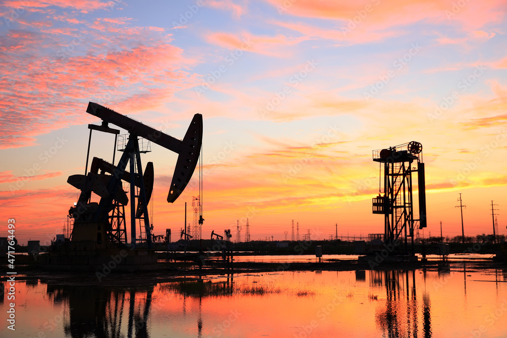 Tableau sur toile in the evening, oil pumps are running, The oil pump and the beautiful sunset reflected in the water, the silhouette of the beam pumping unit in the evening