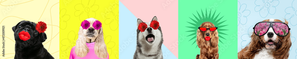 Tableau sur toile Contemporary art collage with cute purebred dogs and trendy colored backgrounds with geometric styled elements