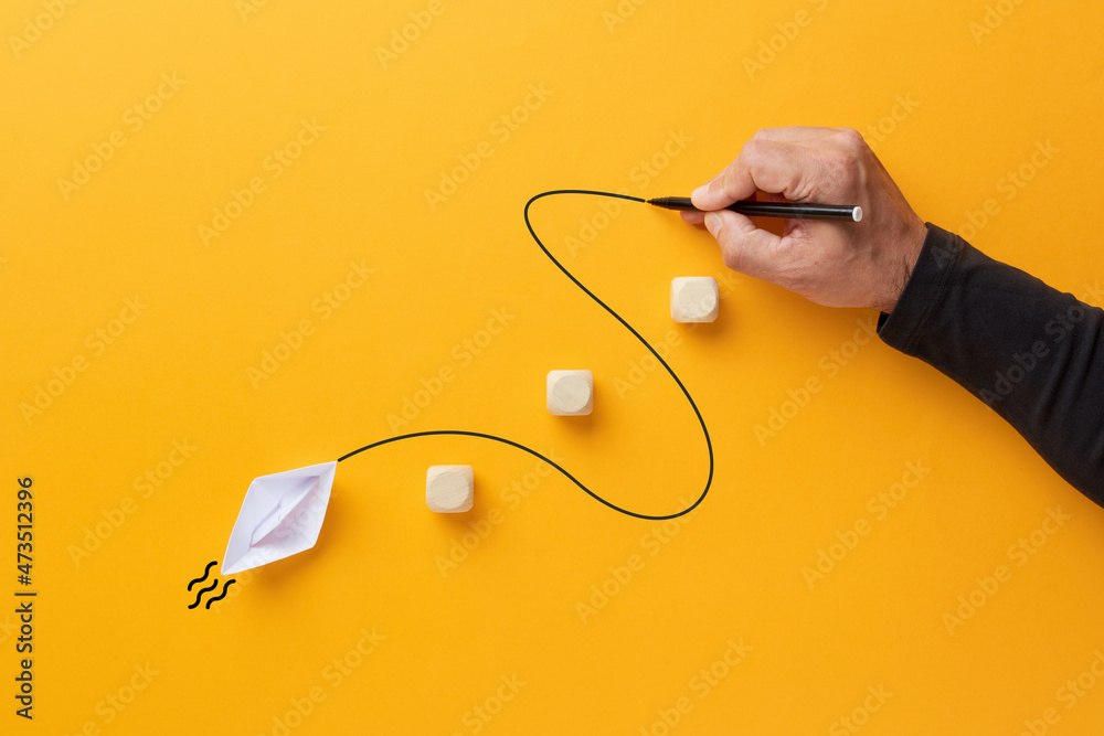 Tableau sur toile Male hand draws a curved line that guides a paper boat to cross the barriers