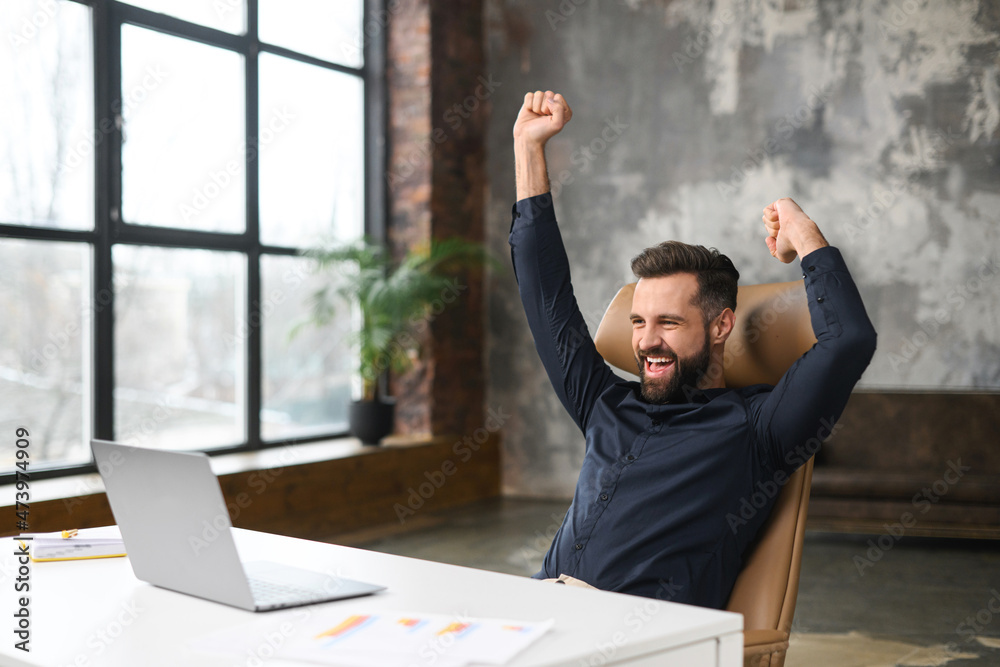 Tableau sur toile Excited young businessman in smart casual wear celebrating successful deal, look
