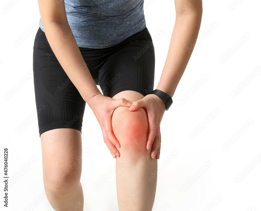 Tableau sur toile A woman in sportswear is holding a painful knee joint (marked in red)