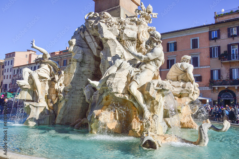 Tableau sur toile Fontana dei Quattro Fiumi (Fountain of the Four Rivers) at the Piazza Navona square in Rome, Italy