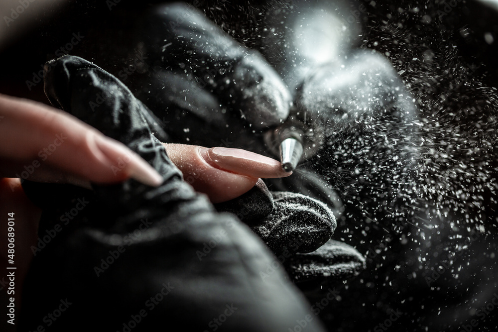 Tableau sur toile Manicurist is applying electric nail file drill to manicure on female fingers