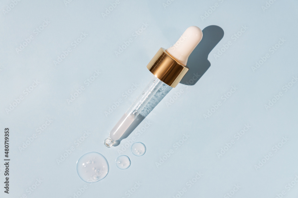 Tableau sur toile Pink beauty face oil dripping from gold dropper on blue background